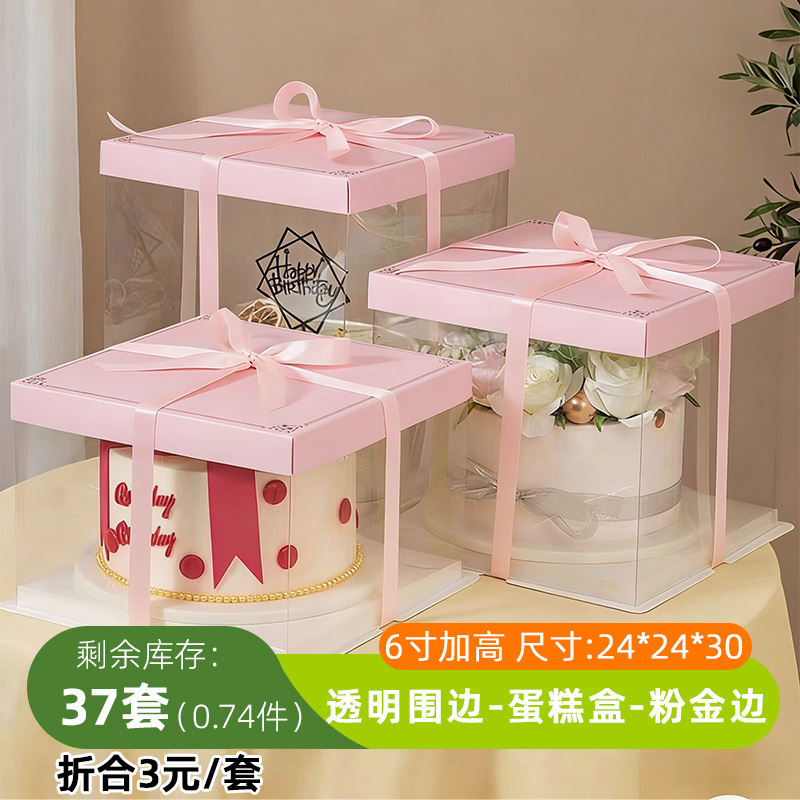 清仓品>>FG——6寸加高——透明围边-蛋糕盒-粉金边 (24*24*30)